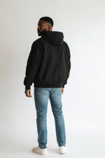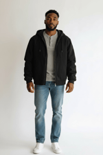 Veste à col capuche de couleur noire, coupe droite en toile de coton épaisse.