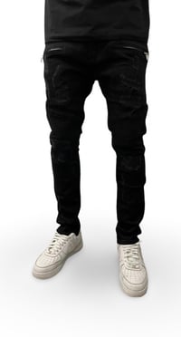 Ce jean est conçu dans une coupe slim fit, avec des empiècements moto surpiqués sur les cuisses, des poches zippées visibles sur le haut de la cuisse et des coutures articulées aux genoux pour un total look motard.