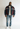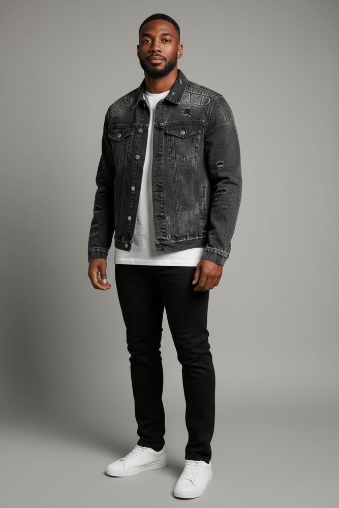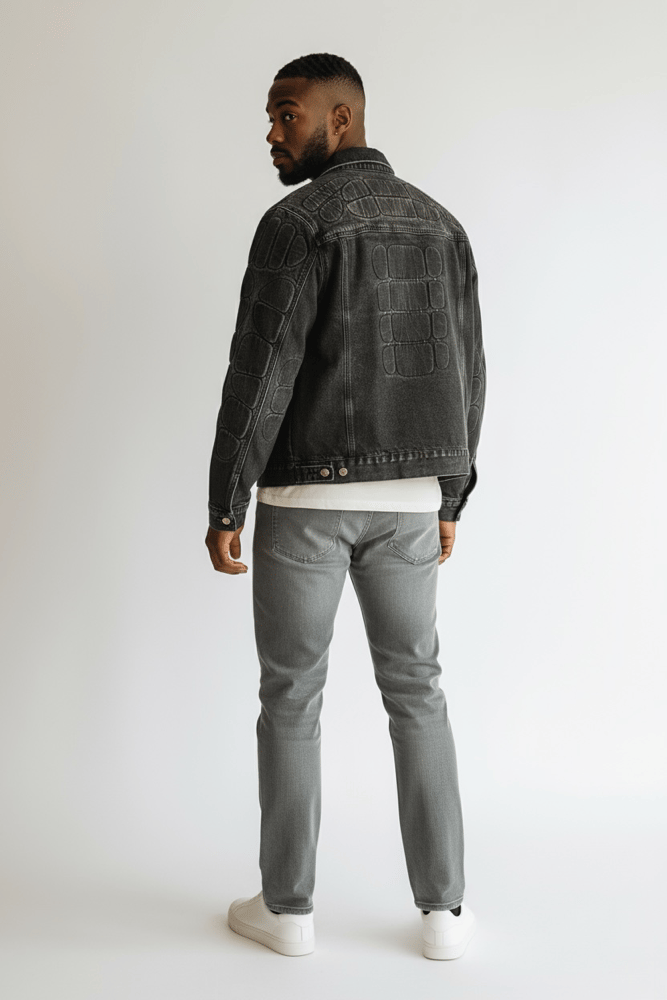 Blouson en 100% denim de couleur noir délavé avec des empiècements boursouflées sur l’avant, les bras et le dos pour un effet motard.