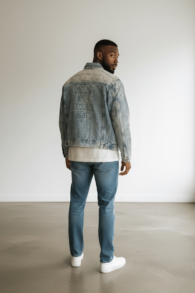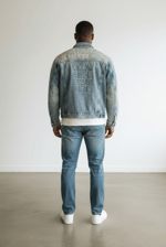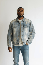 Blouson en 100% denim de couleur bleu délavé avec des empiècements boursouflées sur l’avant, les bras et le dos pour un effet motard.