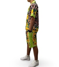 Ensemble chemise et short de couleurs vert et jaune multicolore, imprimé tigré, roses jaunes et imprimé gueule de tigre et logo Savage Couture®️ dans le dos de la chemise.