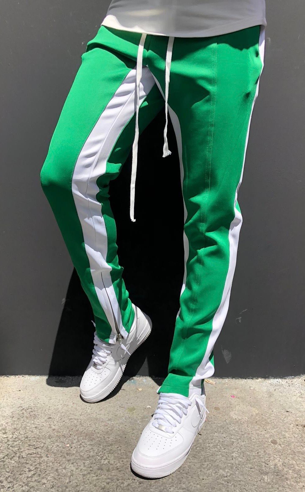 Pantalon bicolore en lycra vert avec bandes latérales et intérieures blanches