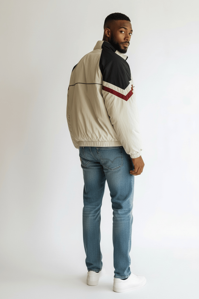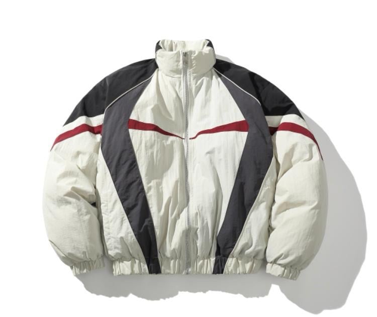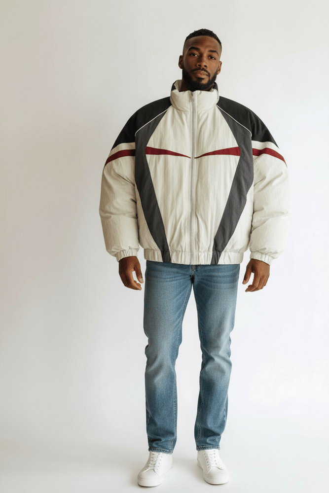 Blouson de coupe bomber matelassé de couleur beige clair, avec des détails multicolors.