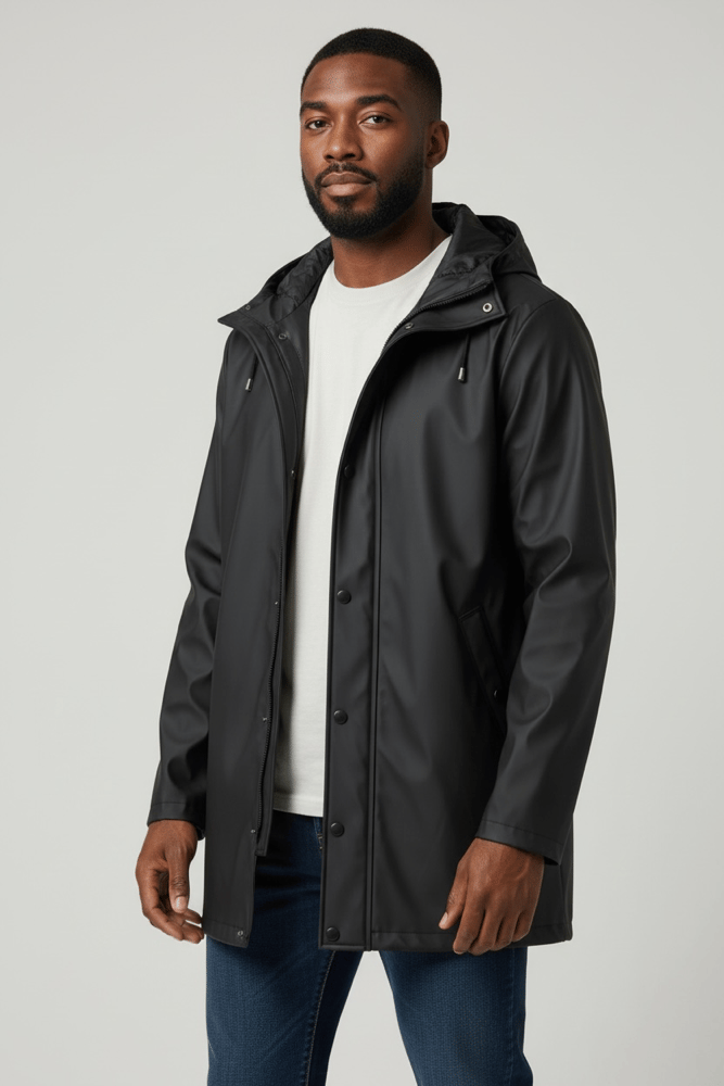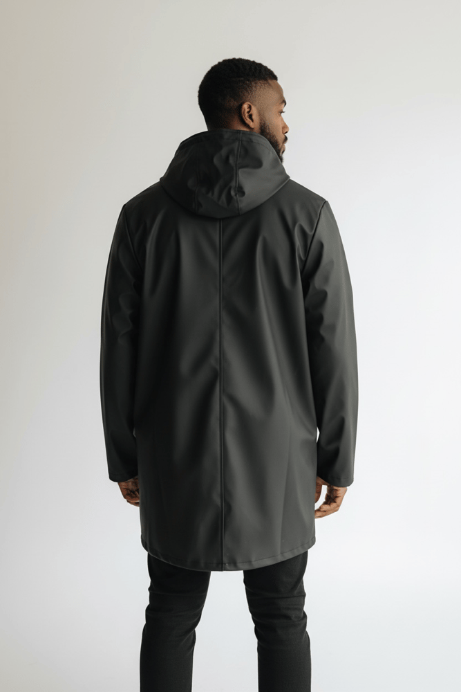 Veste de pluie moderne elle se distingue par une silhouette minimaliste particulièrement fonctionnelle.